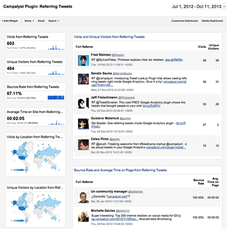 En su versión gratuita, muestra para los últimos 5 días, los tweets en los que ha sido compartida tu página (dentro de Google Analytics). En su propia página te comparten un dashboard donde poder contemplar toda la información sobre los tweets.